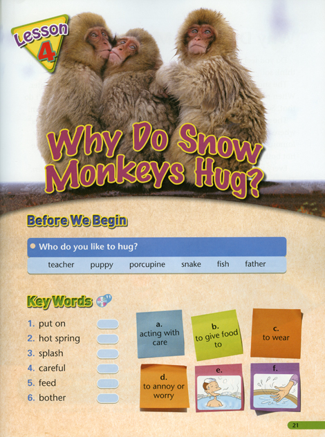 I just got a copy of an English language textbook that will be used at elementary schools in Korea. Lesson 4 is Why Do Snow Monkeys Hug? and includes my Monkey Hug photograph.
