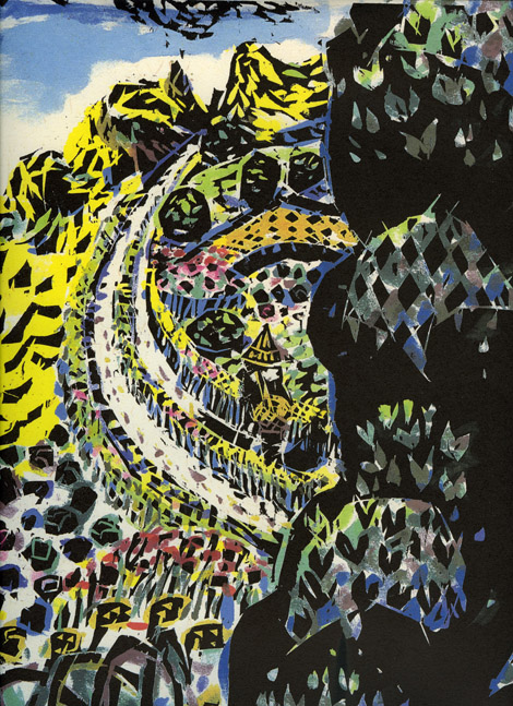 “I begin with a vague idea of what the image will be like, but as soon as I start to carve the wood, things change. The whole process is very fluid, almost like someone is working through me. I’m not creating the image directly on the paper, but in the wood which I’ll then print from. Because of this, I feel the process has an almost spiritual quality. You’re never quite sure what’s going to happen.