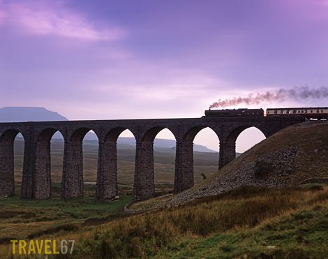 Steam train crosses Ribblehead Viaduct railway North Yorkshire dales