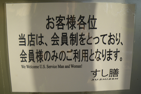I had expected this situation would make me feel angry, but instead I feel disappointment and sadness. Would his American customers feel so comfortable if they could read the signs telling Japanese they are not welcome. How would an American servicewoman feel if she was married to, or dating, a Japanese national and found that they were not allowed to eat there.