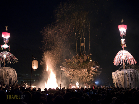 A “shaden” or temporary shrine is built of beach wood and then the town’s 42 year old men (an unlucky age) sit on the top. The town’s 25 year old men (another unlucky age), drunk with sake, stand at the base of the shrine. Local men and boys carrying flaming torches try to set fire to the shaden while the drunken 25 year olds must protect them by hitting the torches with pine branches.