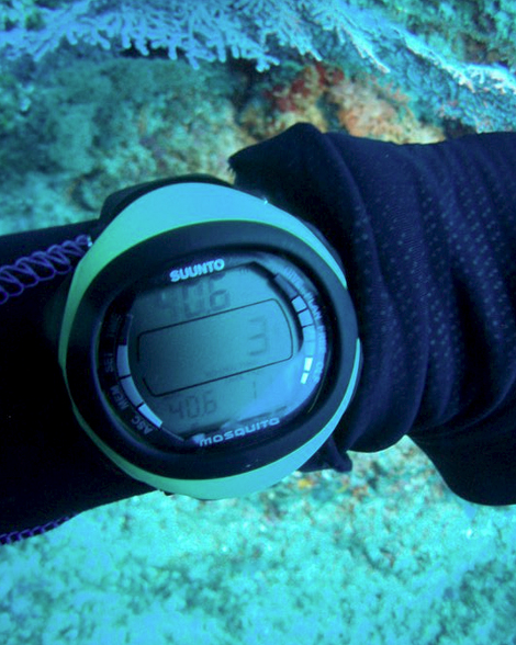 My dive buddy Hiroshi thought that we might be able to see Pygmy Sea Horses on the fan corals so we dropped down to a large group of fan corals at 40 meters. My watch blinked to tell me I was 60 centimeters below the limit, and more importantly that I had a maximum of 3 minutes at that depth. Our search for pygmy sea horses was therefore rapid, and not surprisingly, unsuccessful. We then slowly ascended before having a long leisurely safety stop at 5 meters.