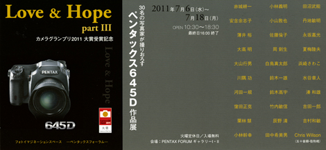 Part III of the Pentax Love & Hope exhibition will take place July 6th to 18th at the Pentax Forum Galleries I & II. I’m going to fly up to see the last weekend of the exhibit. Will be cool to see one of my photographs, printed so large, hanging on the wall.