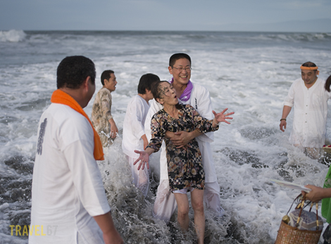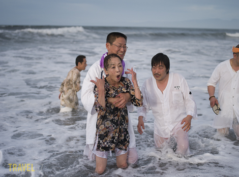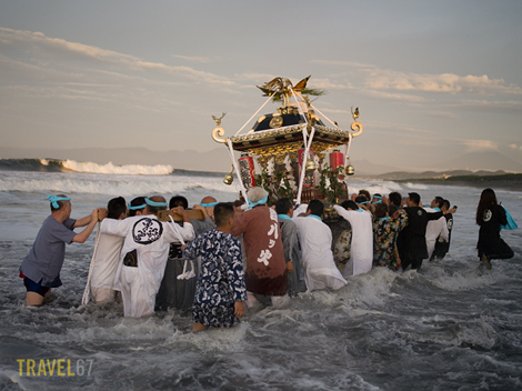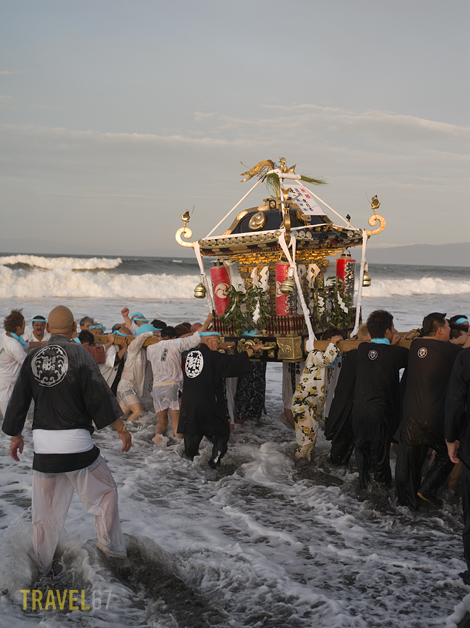 The mikoshi don’t go underwater, although they do get splashed. The top photo is pretty representative of how deep the people holding the mikoshi went into the sea.