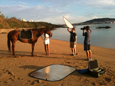 The medium size trigrip is a good size for putting a person or couple into shade when shooting in the harsh Okinawan sun. It is also a useful way to reduce the strength of the light when shooting into the sun backlighting the hair. In the shot below I used it to control the light on the model and her white dress. It also stopped her from squinting. The size of the diffuser will determine the area of soft light, for example with a medium trigrip I wouldn’t have been able to put both the model and horse into shadow. (Lying on the beach is a large reflector rather than a diffuser.)