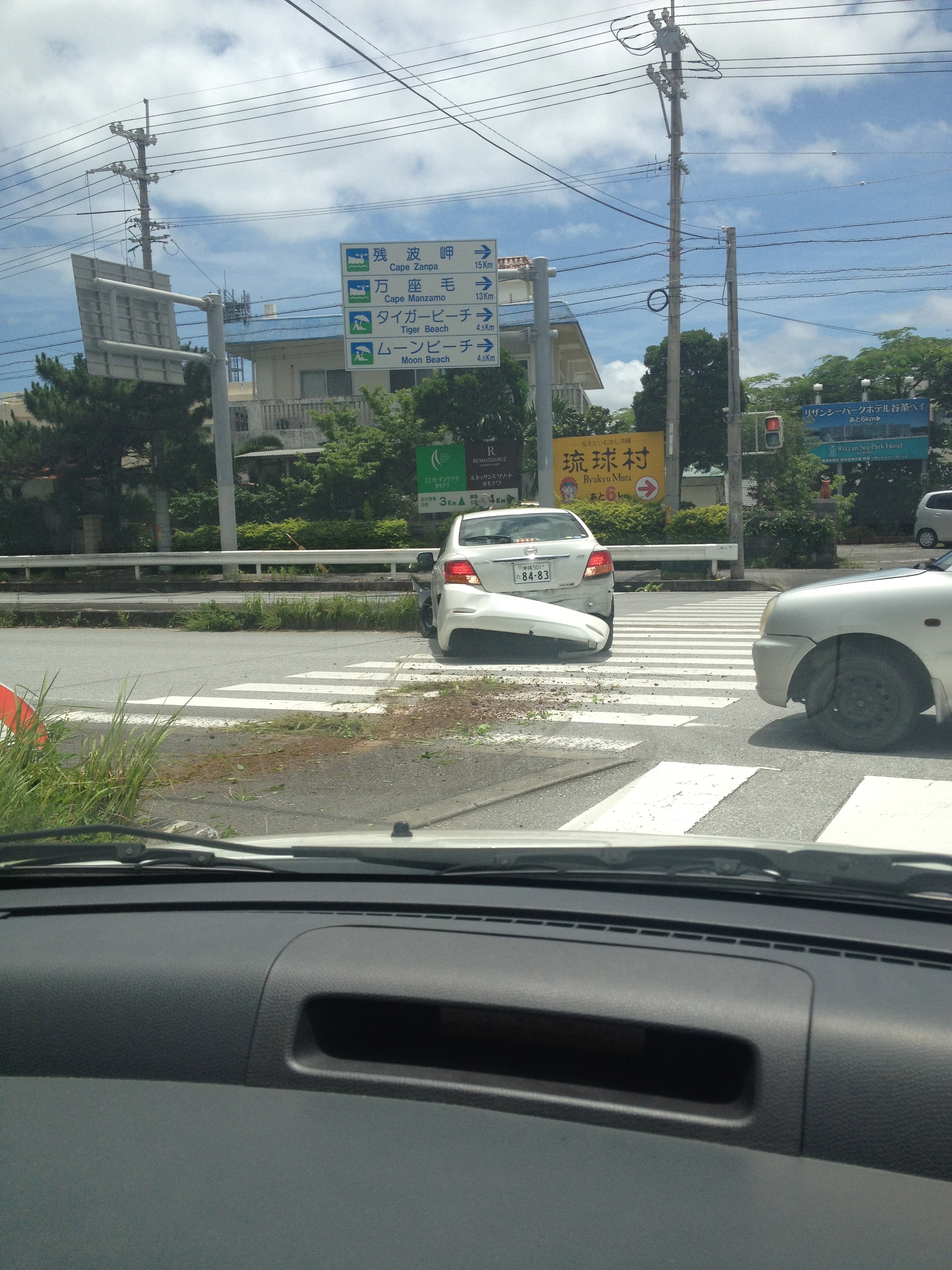 Had an eventful day today. As I was leaving the Okinawa expressway at the Ishikawa exit, in my rearview mirror I glanced a white car hurtling up behind me. I guess it was doing about 120 KPH exiting the expressway and not slowing at all. The car swerved around me hit the railing, careened across the road hitting the road markers and grass, but didn’t stop. It seemed the driver kept his foot to the floor as he veered back across the road hit the railing again then ricocheted back across again up the grass and drove along the banking. I thought he was going to flip, but he dropped back to the road, and kept on going. He went through the little tunnel under the expressway and then amazingly through the automatic barrier of the toll gate.