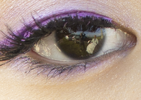 When you open the image up at 100% you can see how I took the photo by looking in her eye. There’s me in the middle holding the camera. To my right is the farmer who wandered past and was press-ganged into holding a reflector. My friend, Shawn Miller, is standing just out of shot. He’s holding a Lastolite diffusion panel, the bottom of which is just visible on the left side of her iris. Behind me is Shawn’s Nissan Terrano and behind that is my little Suzuki Swift. You can even see that I’m standing on the banking giving me a little height so that I keep the flowers rather than the sky in the background behind the model.