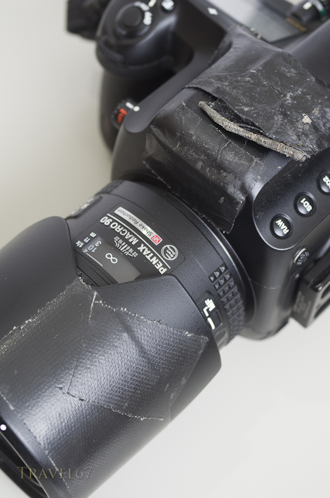It’s also not a bad idea to give your camera a makeover so that it looks a little older and beaten up. An opportunist thief is less likely to want to steal your gear, when there are pristine brand name cameras that would be much easier to resell. I put a few pieces of black duct tape across the logo, over the top of the camera, on the corners of the body and on the lens hood. All can be easily removed later. (As you can see I wasn’t planning on using the hot shoe.) Of course, your equipment could still get stolen, mislaid or damaged, so it’s a good idea to have insurance. A different strap and a little duct tape, however, could prevent your dream vacation from becoming a bit of a nightmare.
