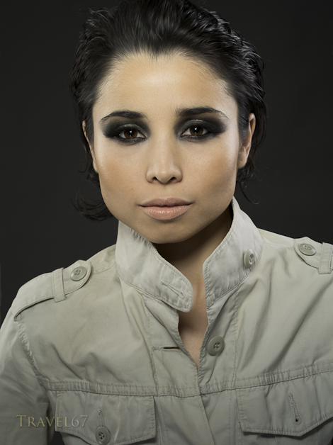 Lighting – Charcoal background. Beauty dish powered by Profoto Pro-7a as the main light. Small softbox as low fill. Medium size strip softboxes on both sides adding rimlight (powered by Profoto compacts). A fifth compact aimed at the background. Strobes triggered with PocketWizards.