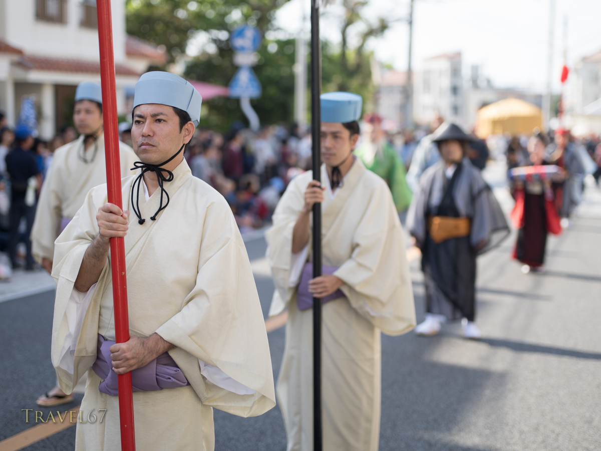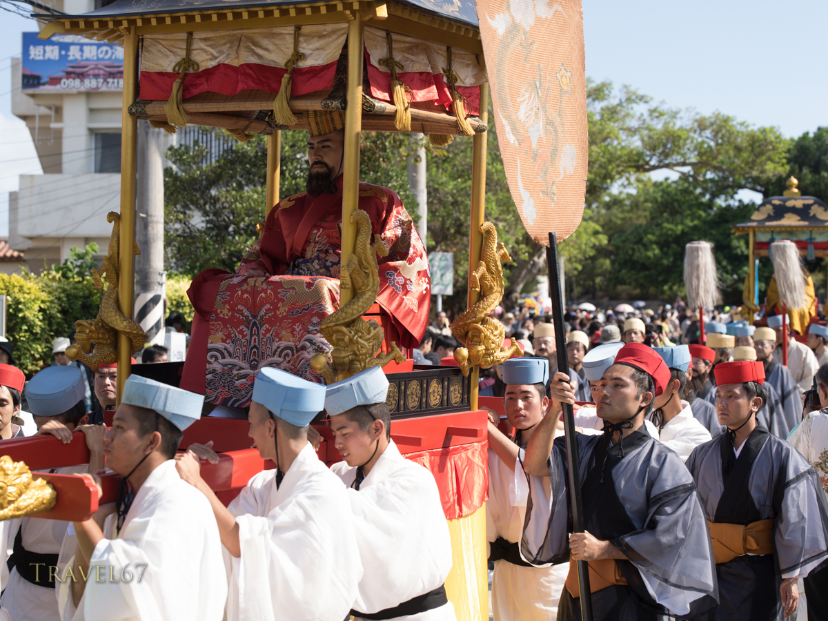 On November 3rd the ceremony begins in the courtyard of Shurijo. The procession of courtiers, envoys, guards, regents, and of course the king and queen then parade out of the castle. They descend through the various gateways and along the main road almost to the monorail station.