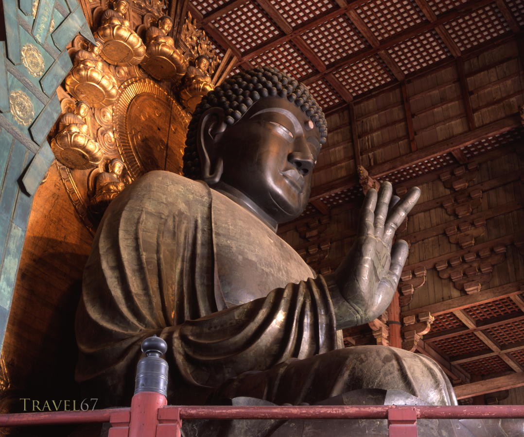 The Great Buddha, bosatsu and guardians are housed in the Daibutsu-den Hall. The huge wooden structure is a 1709 reconstruction, and is, in fact, only two-thirds the size of the original. The present Daibusteu-den, however, still holds the title of the largest wooden building in the world.