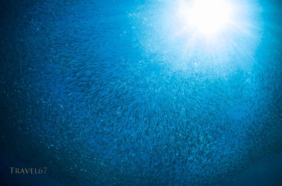 October 14, 2016 underwater Spratelloides gracilis – Silver-stripe round herring shoal / bait ball at Cape Maeda, Okinawa.