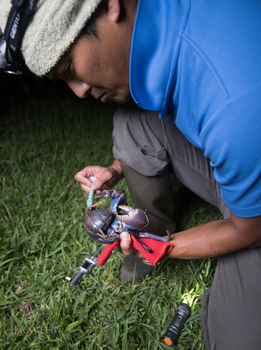 June 28, 2017 645Z1317SE1080 Coconut Crab ( Birgus latro ) monitoring in Motobu, Okinawa, Japan the northern most habitat of the species. Marine biologist Shinichiro Oka inserting a tag into smal male crab.