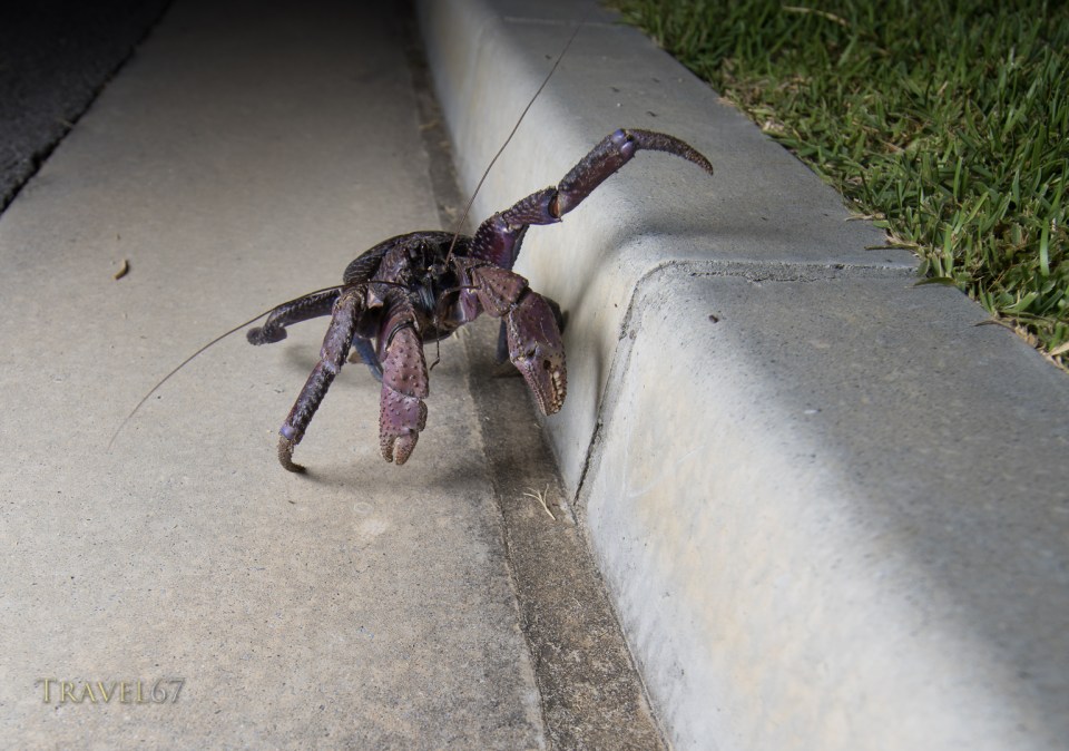 June 28, 2017 645Z1343SE1080 Coconut Crab ( Birgus latro ) monitoring in Motobu, Okinawa, Japan the northern most habitat of the species. Coconut crab climbing up roadside kerb.