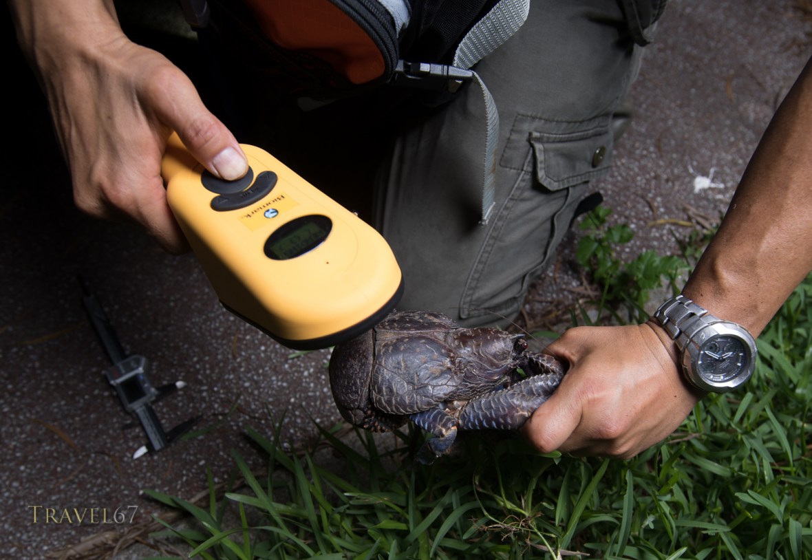 June 28, 2017 645Z1372SE1080 Coconut Crab ( Birgus latro ) monitoring in Motobu, Okinawa, Japan the northern most habitat of the species. Marine biologist Shinichiro Oka checking a small male crab for an implanted tag.