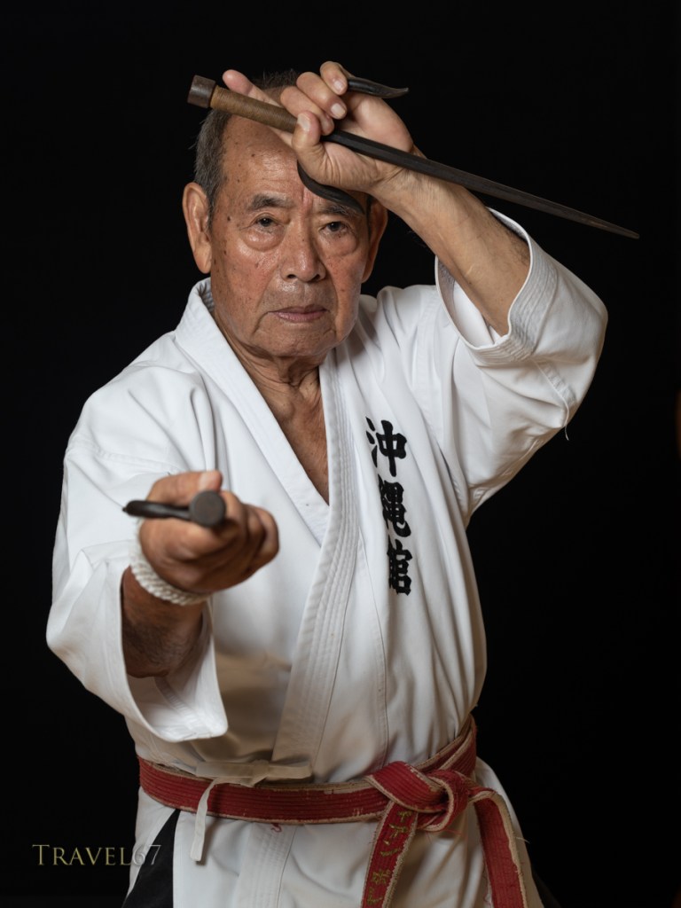 Nakamoto Sensei studied kobudo under Shosei Kina Sensei, then Shinei Kyan Sensei. He now hold the rank of 10th-dan.