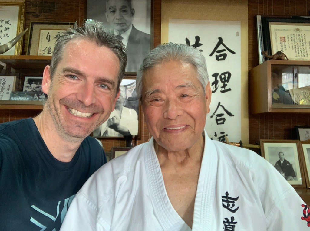 Kenyu Chinen9th-dan World Oshukai Okinawa Shorin-Ryu Karate Do Kobudo Federation with student Kohei Oshiro. Photographed at the Yomitan Dojo 4th November 2019