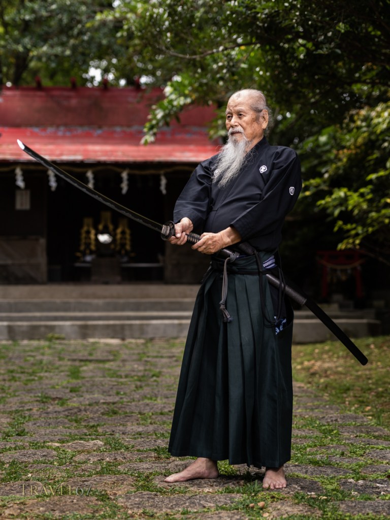83-year-old Hisao Hamamoto, iaido master with samurai sword in Okinawa Japan. Style name is Koden HachimanRyu Jissen BattoJutsu Hamamotoden BattoKai