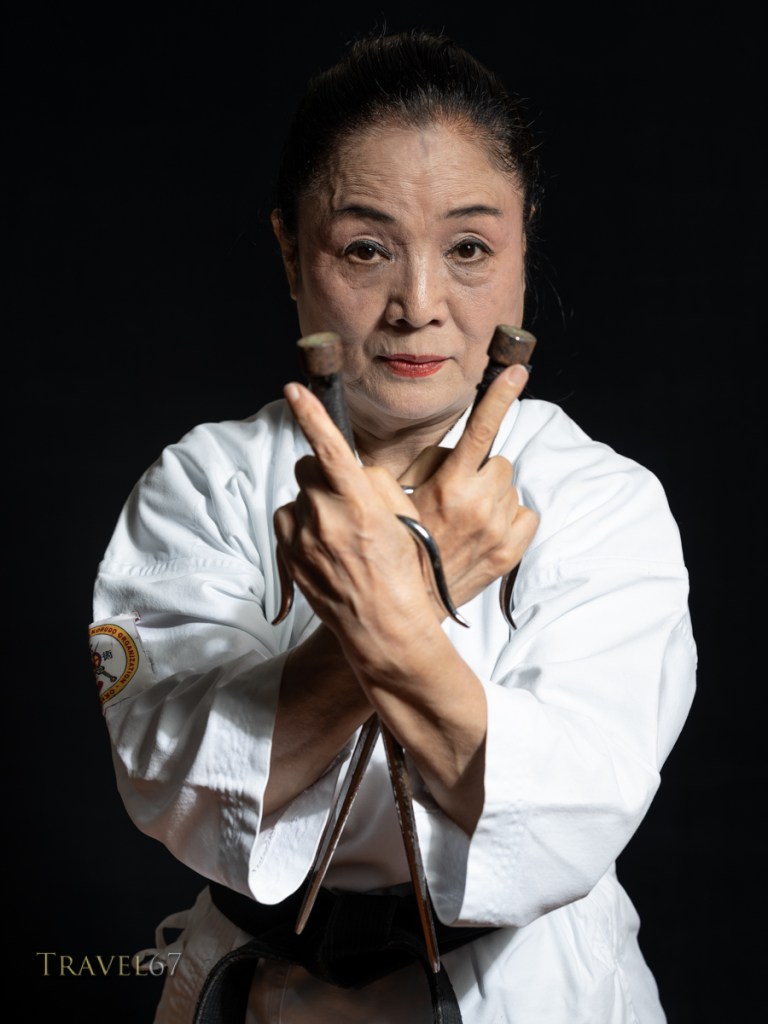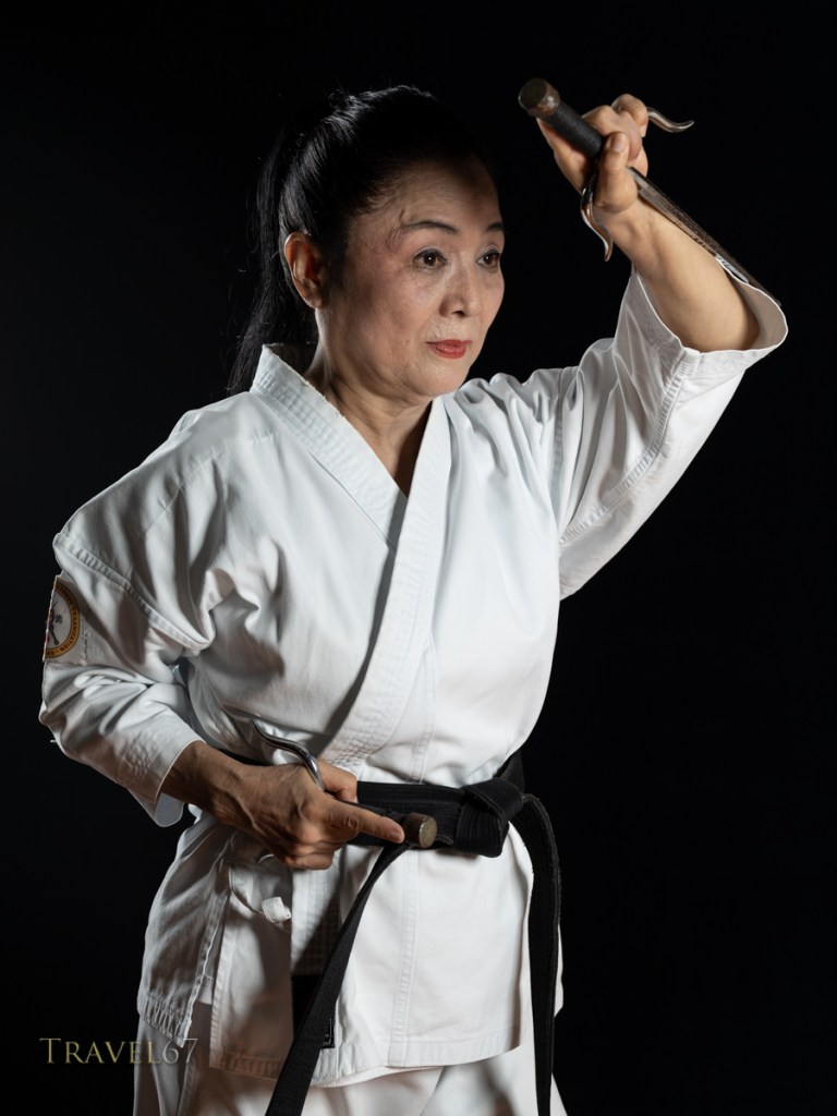 In all the above shots of Toma Sensei I used two lights. James is holding one Profoto B1 strobe with a white softlight reflector (AKA a beauty dish) while Toma Sensei’s granddaughter is holding a second Profoto B1 strobe with a 1×4′ strip softbox which provides a rim light. In all the shots for the Karate Masters Portrait Project I only use the single strobe James is holding. In the Ryukyu dance portraits, the extra light provides separation from the black background, which is particularly useful if the person has dark hair.