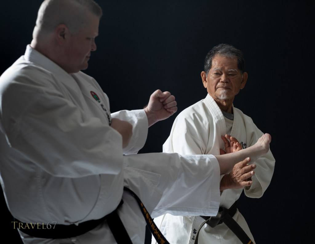 當山 全秋 範士十段 剛柔流空手 Photographed December 19th, 2020 at his dojo in Awase, Okinawa training with his student Scot Mertz 7th-dan.Zenshu Toyama, 10th-dan, Goju-ryu Karate