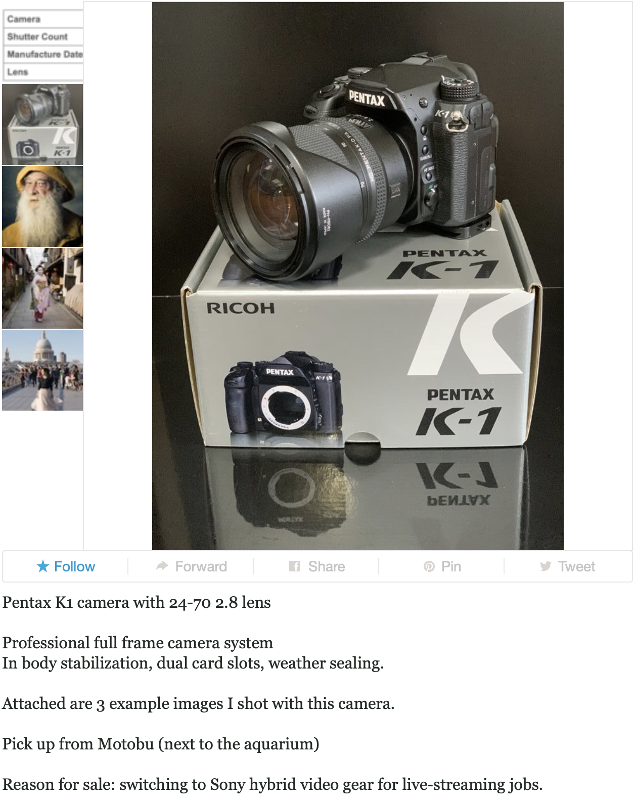 If you’re interested in purchasing either the Pentax 645Z system or the Pentax K1 system please get in touch. Ideally the buyer would be in Okinawa, Japan would be okay, and I’d ship overseas in certain circumstances.