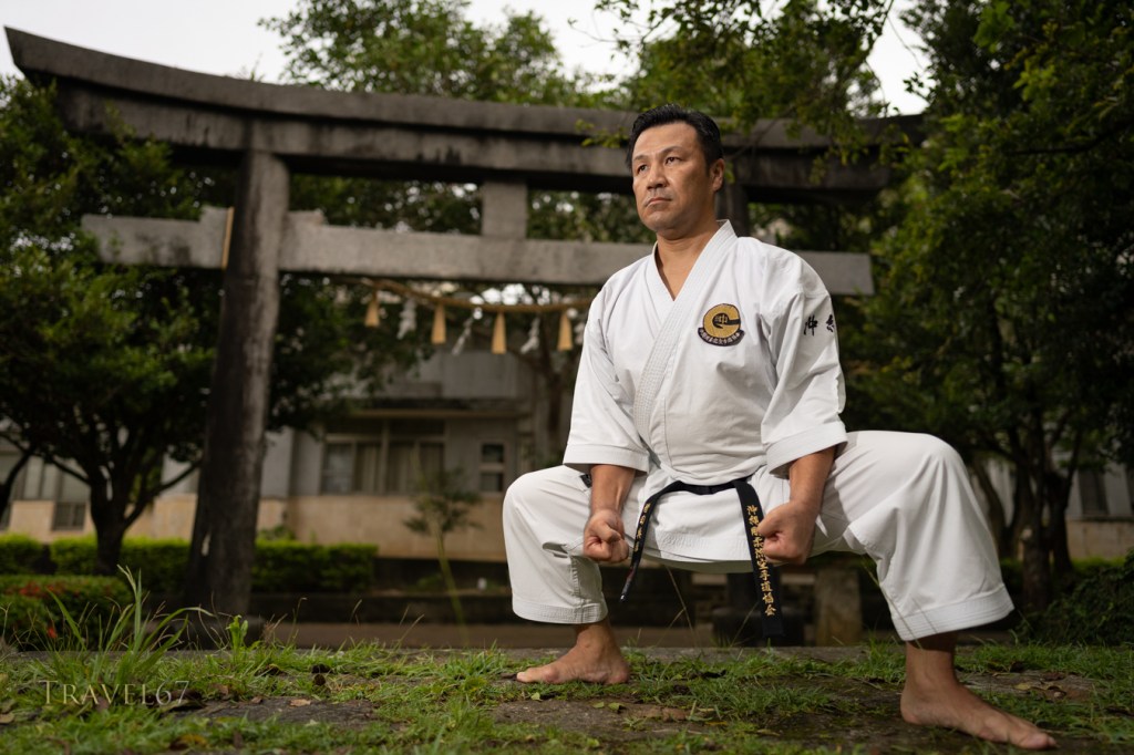 In July, I photographed kata champion, and Goju-ryu master, Norihiko Masuda. We started the shoot at 7AM in Onoyama Park in Naha City. There were very few other people around, but we did have one extra person joining us. Uezato-san from the Ryukyu Shimpo newspaper came along to take some behind the scenes pics of our shoot, and interview both us and Masuda Sensei about the Karate Masters Portrait Project.