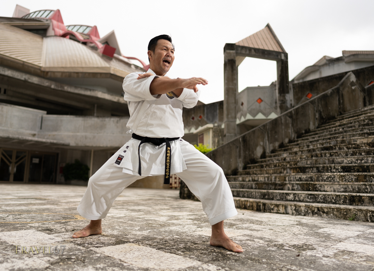 In July, I photographed kata champion, and Goju-ryu master, Norihiko Masuda. We started the shoot at 7AM in Onoyama Park in Naha City. There were very few other people around, but we did have one extra person joining us. Uezato-san from the Ryukyu Shimpo newspaper came along to take some behind the scenes pics of our shoot, and interview both us and Masuda Sensei about the Karate Masters Portrait Project.