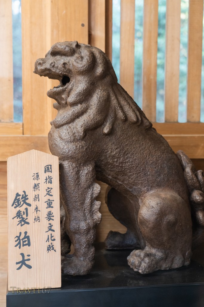 As a Shinto shrine, the entrance is marked by a giant torii gate. There are komainu guardians, flanking the steps to the main shrine buidling, and another sacred komainu housed inside.