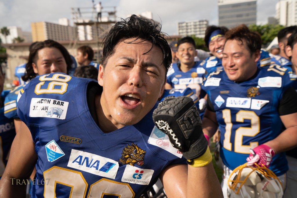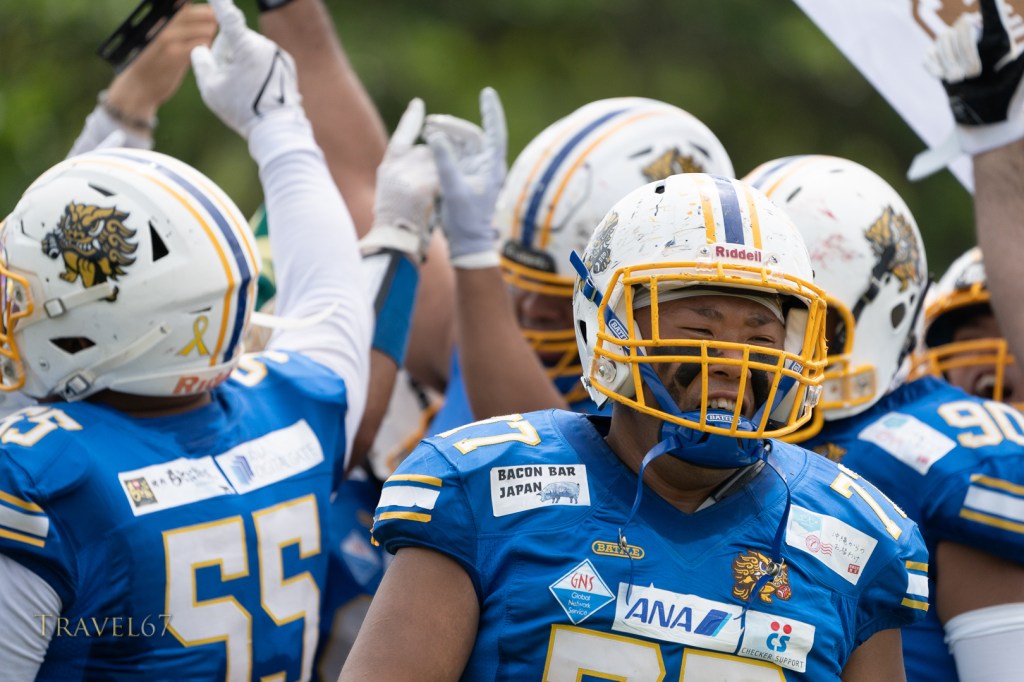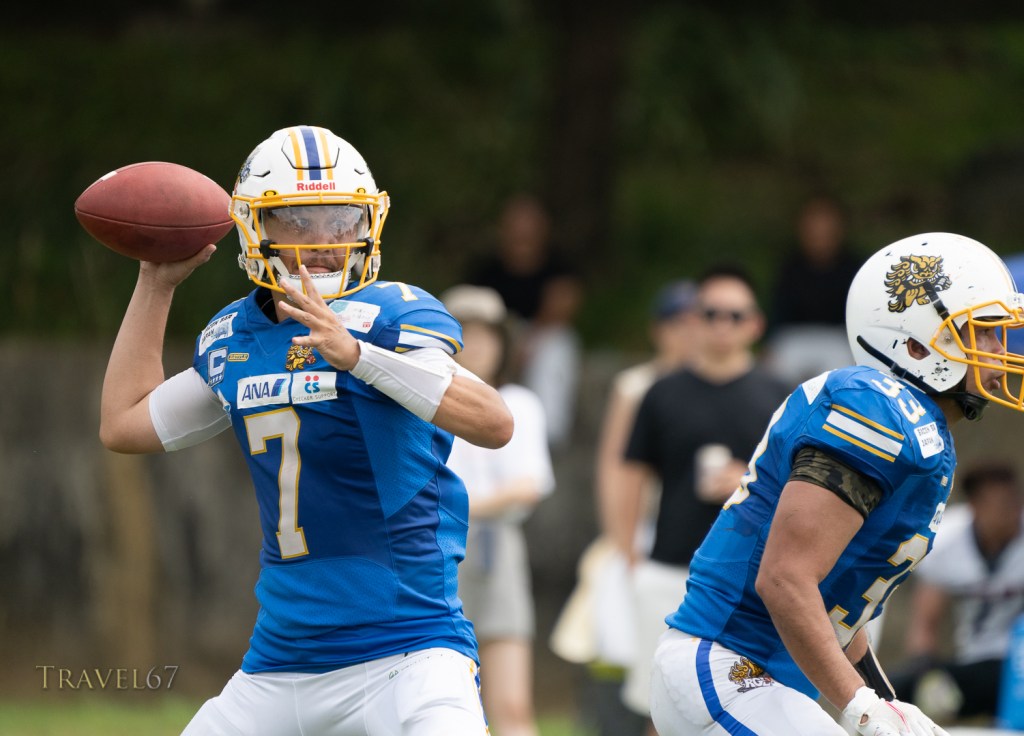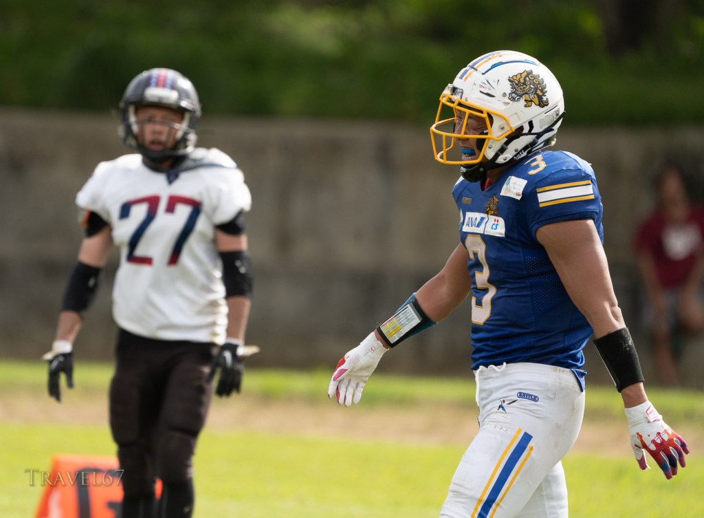 I managed to get they key shots I wanted which included the quaterback 藤原 慶太 throwing the ball, and defensive line Gabe Edwards shutting down the opposition. Wide receiver 池口 伸之 had a fantastic run to score a touchdown that sealed the game.