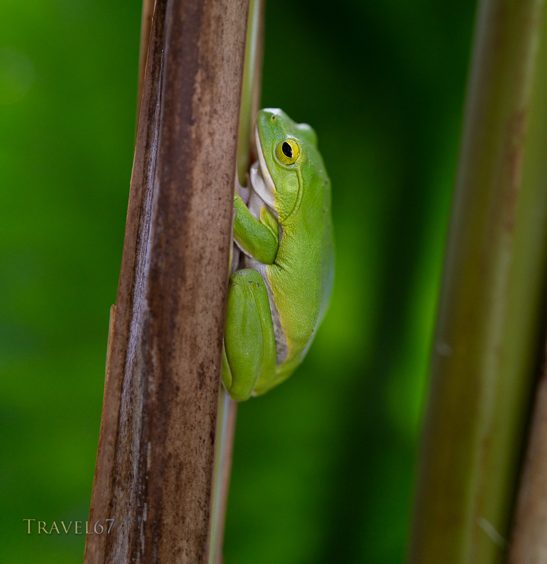 While working in the garden cutting back the shell ginger (Alpinia zerumbet) I came across this cute Okinawa green tree frog (Zhangixalus viridis). Jasmine was interested to see the frog with its giant sticky toes, and bright yellow eyes. I got a few pics and video with the iphone before going back and getting the big camera.