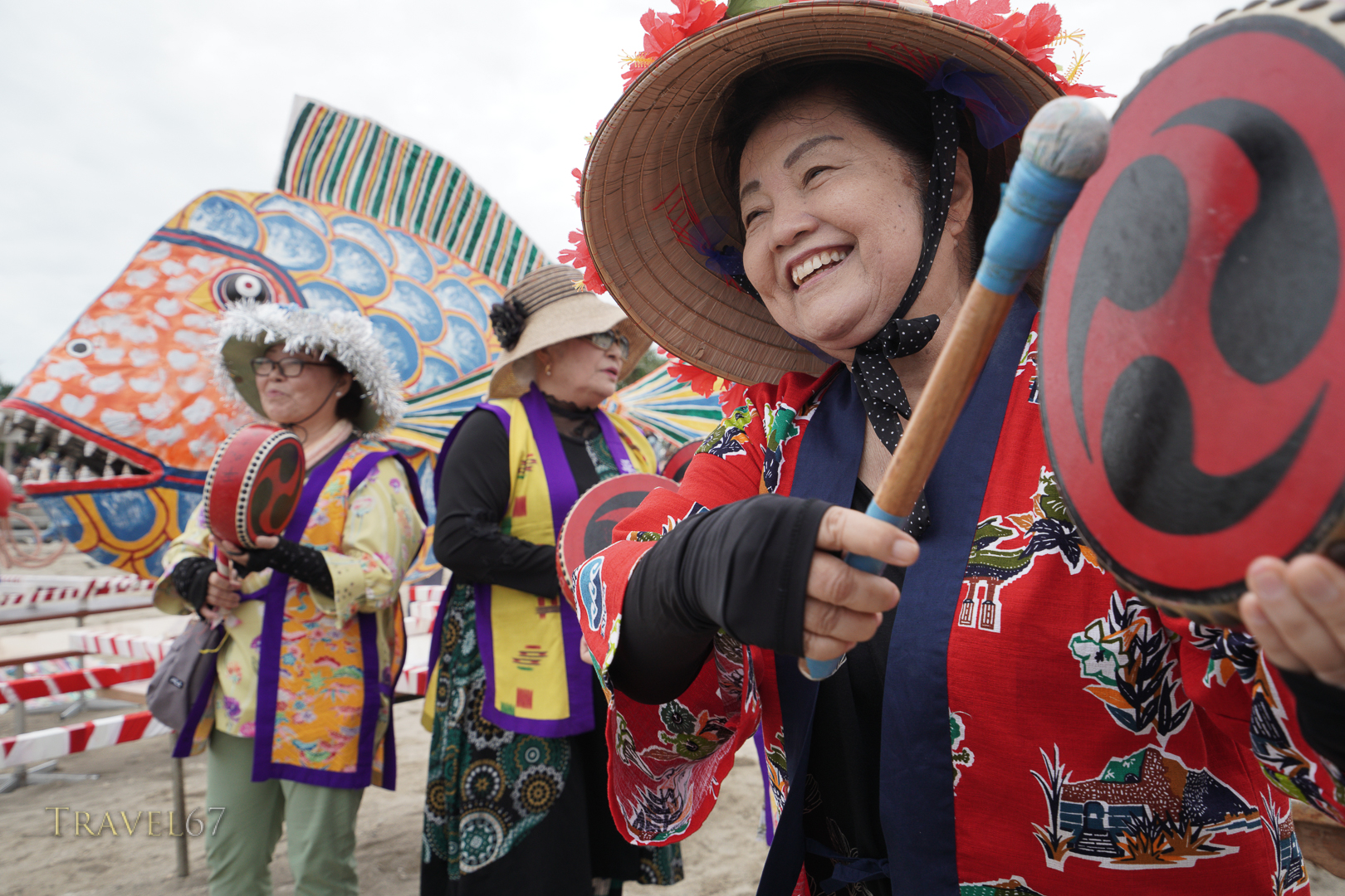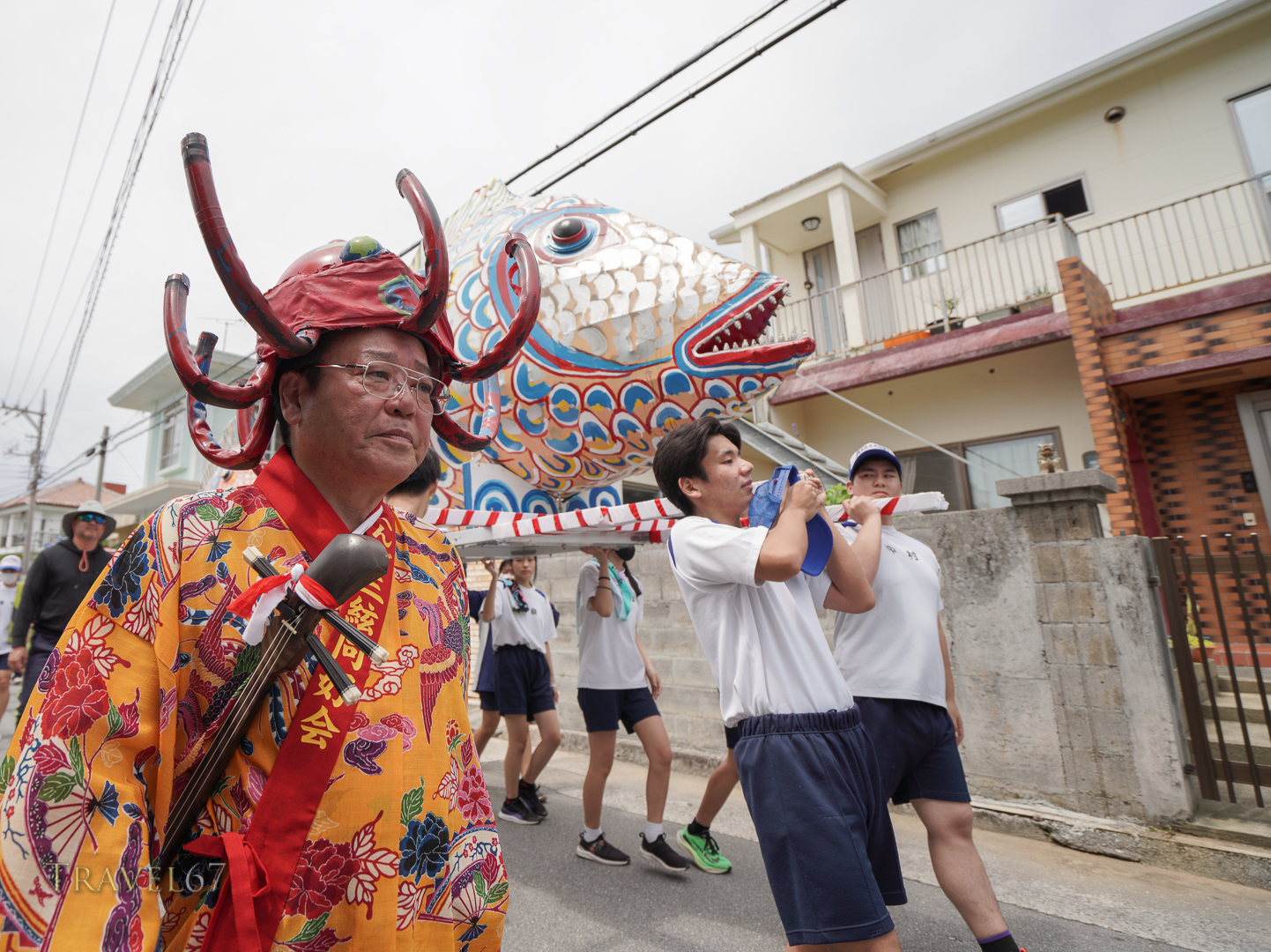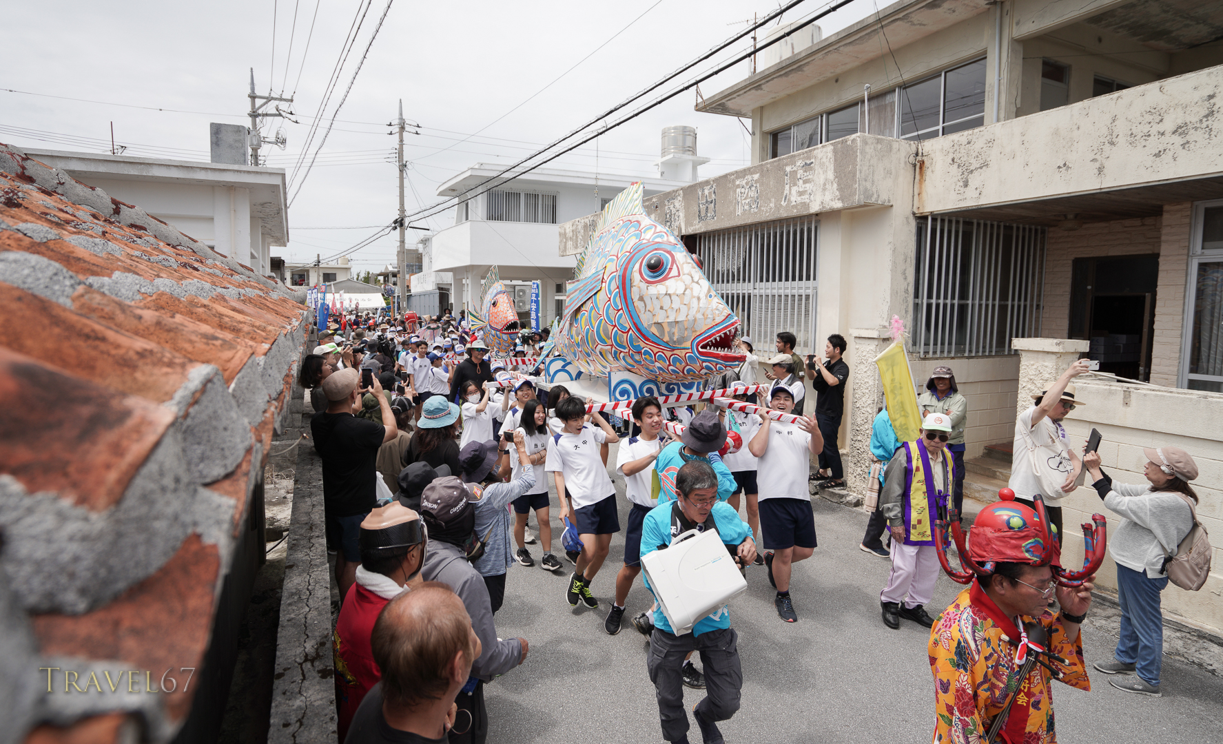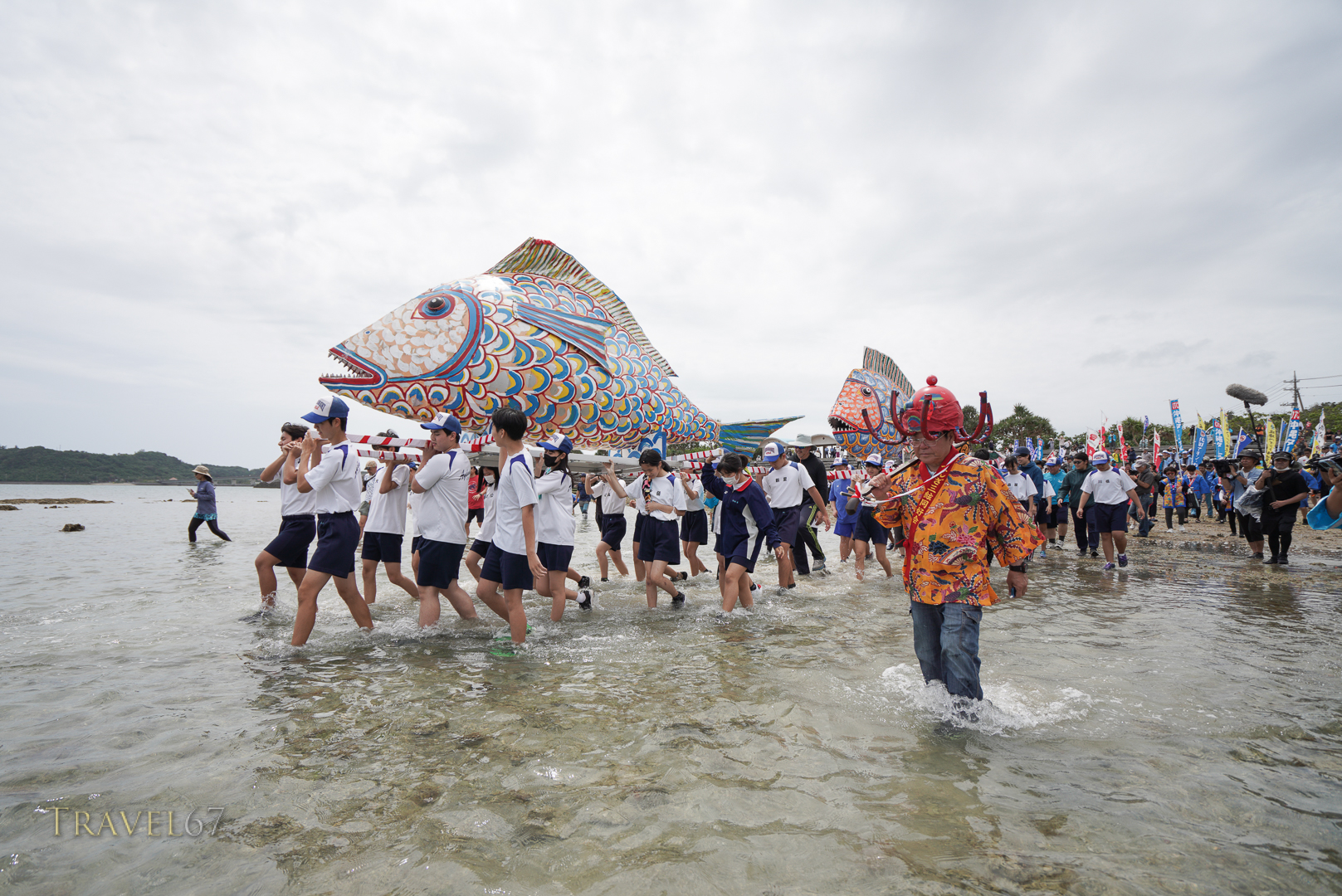 Two large paper fish are carried by teams of local school children through town and then out into the ocean. The elderly residents at the village’s day service came out to wave as the procession went past.