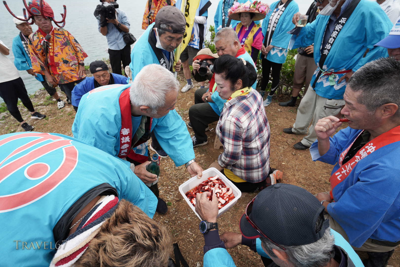 At low tide, everyone was able to wade across through thigh deep water to the nearby island. There the local priestess gave a blessing over offerings of awamori, fruit, and containers of diced octopus.