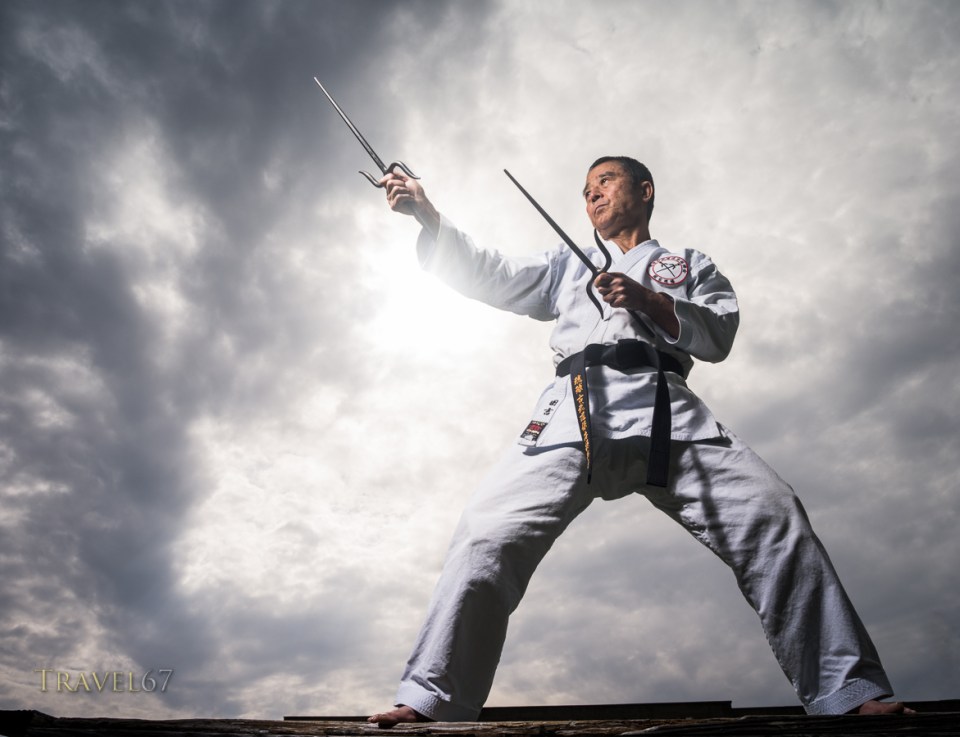 March 30, 2016 3_6455037-1SE900 Yukio Kuniyoshi. Kaicho of Ryukyu Kobudo Hozon Shinko Kai. Training on Okinawa, Japan with manji sai.