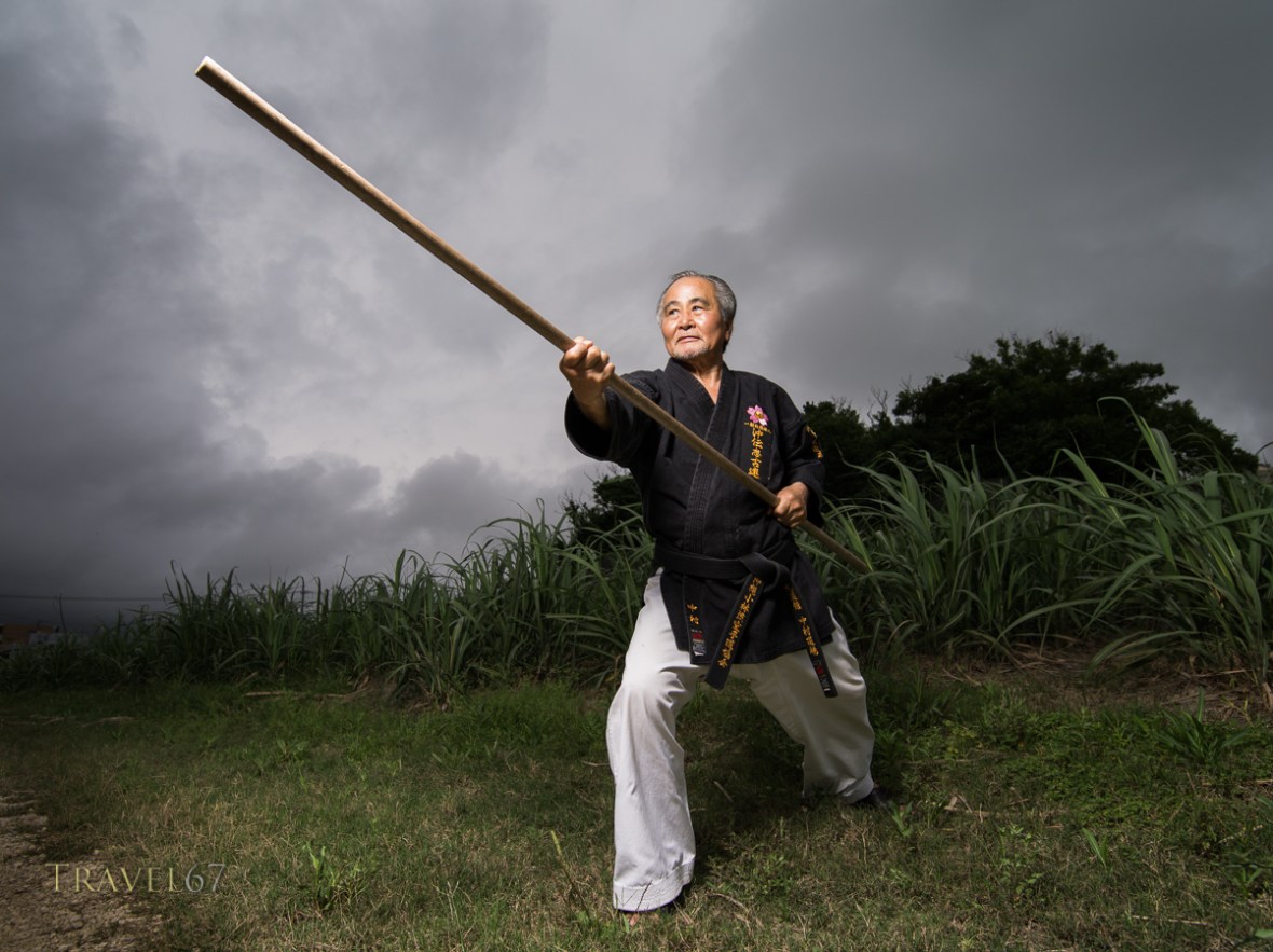 March 30, 2016 4_6457118SE900 Seiyu Nakamura, 10th Dan Okinawa Dentou Shidokan Karate and Kobujutsu. Training with bo staff outside his dojo in Kochinda, Okinawa, Japan.