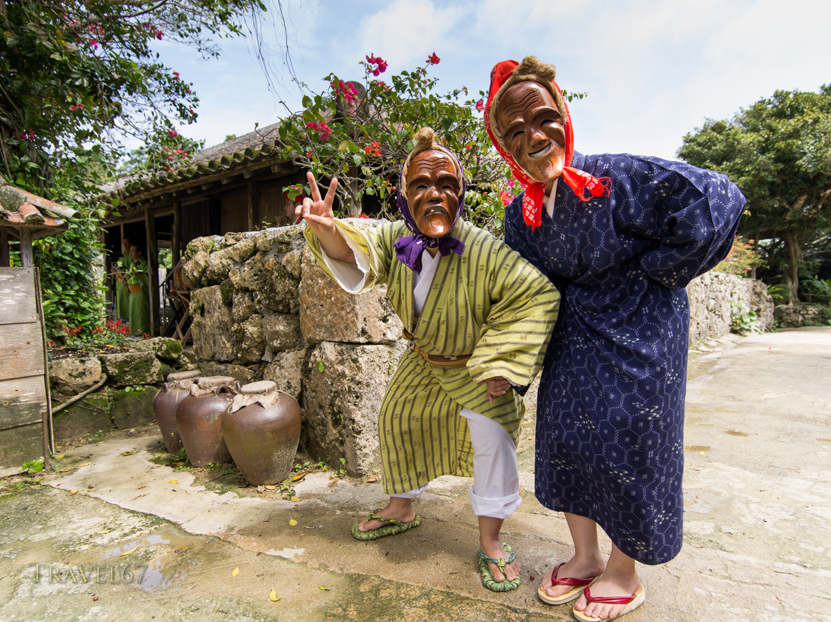 March 29, 2016 51_6456089SE900 Traditional Okinawan dancers wearing masks of smiling elderly people at Ryukyu Mura, Okinawa, Japan