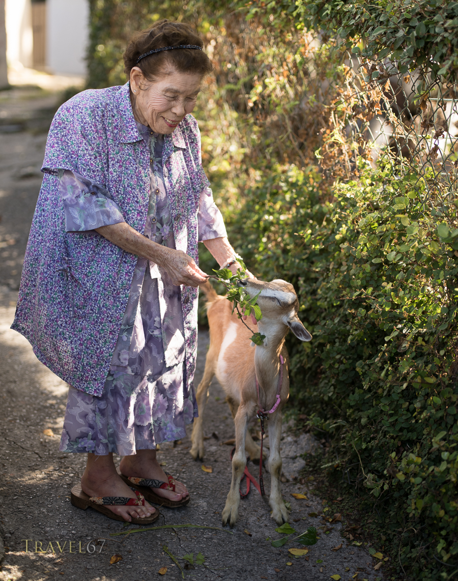March 29, 2016 55645Z9801SE900 Shizuko Hanashiro 98 years old with at goat in Tsuboya Pottery District of Naha City, Okinawa.
