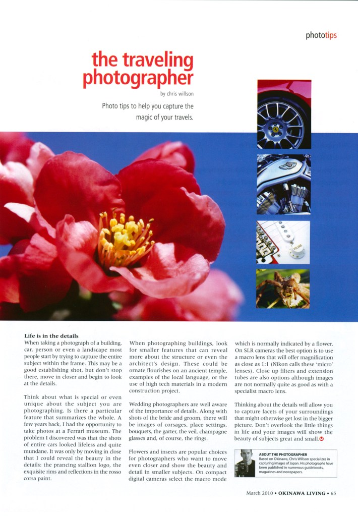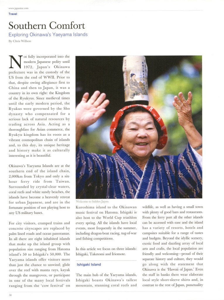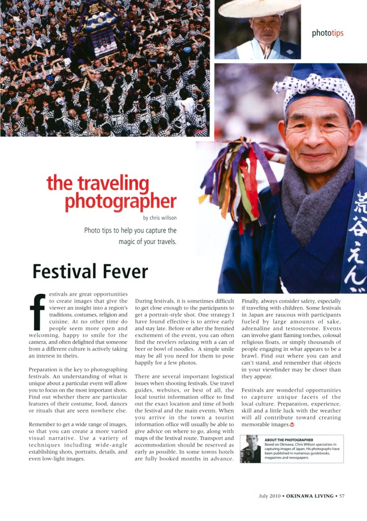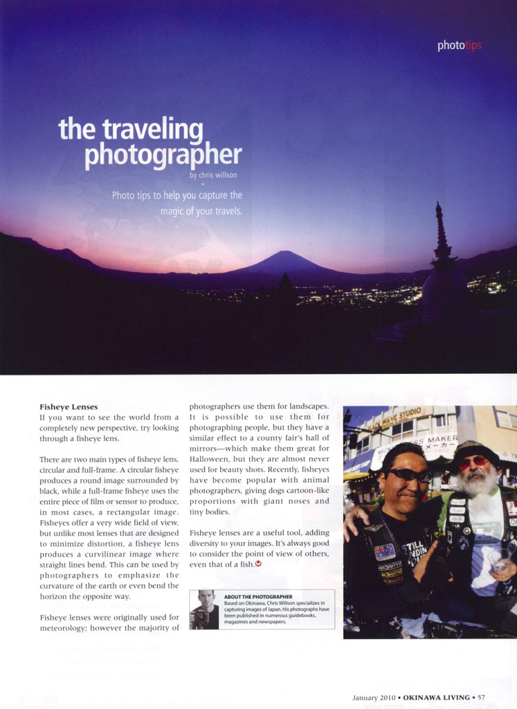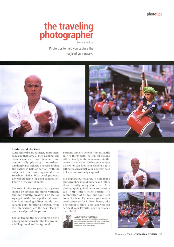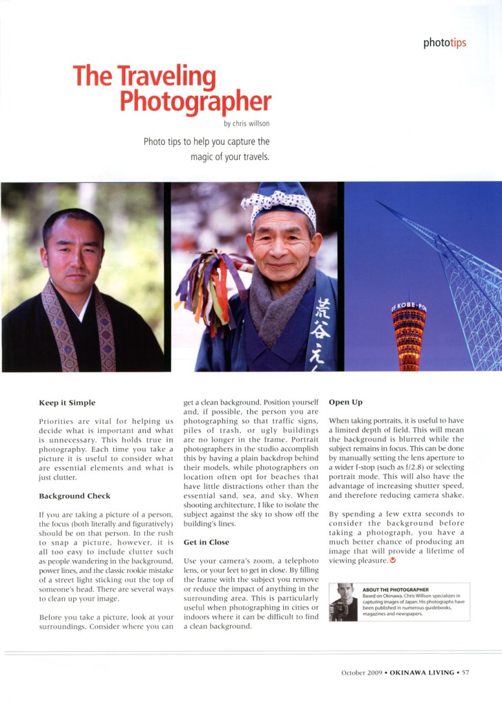 Chris Willson is a British ex-pat photographer, videographer, and travel writer based in Okinawa. He specializes in documenting Japanese festivals, martial arts, and life on Okinawa both on land and underwater. His images often appear in newspapers, magazines and guidebooks.