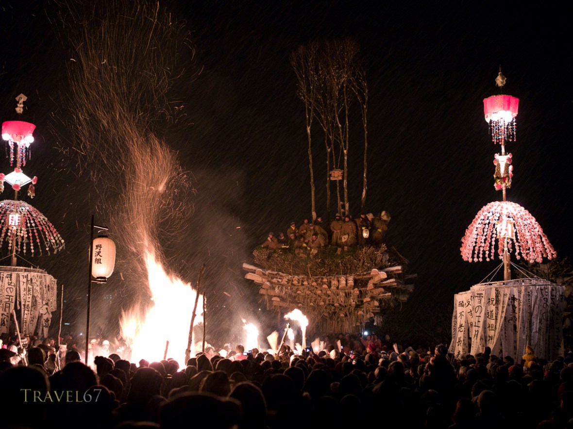 Nozawa Onsen Dosojin Fire Festival, Nagano. A “shaden” or temporary shrine is built of beach wood and then the town’s 42 year old men (an unlucky age) sit on the top. The town’s 25 year old men (another unlucky age), drunk with sake, stand at the base of the shrine. Local men and boys carrying flaming torches try to set fire to the shaden while the drunken 25 year olds must protect them by hitting the torches with pine branches.
