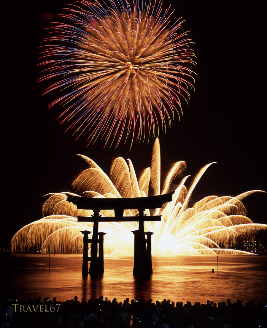 Itsukshima Fireswork Festival, Miyajima, Hiroshima. Each year in August, Itsukushima Shrine hosts its most spectacular event – the fireworks festival. Three barges loaded with pyrotechnics are towed into the bay behind the giant torii gate. Rockets screech into the night, filling the sky with a myriad of fiery flowers and waterfalls.