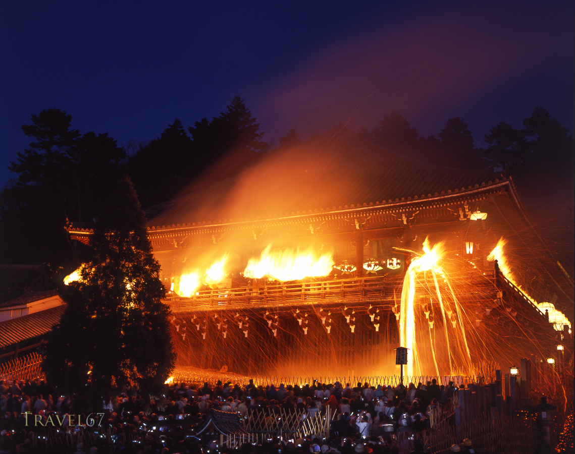 March 24, 2016 Omizutori, Nigatsu-do, Nara Omizutori fire festival at Nigatsu-do Temple, Nara. As monks parade around the temple building with fiery torches, a slow shutter speed allows the flames to blur and turns falling embers into streams of flame cascading down from the temple.